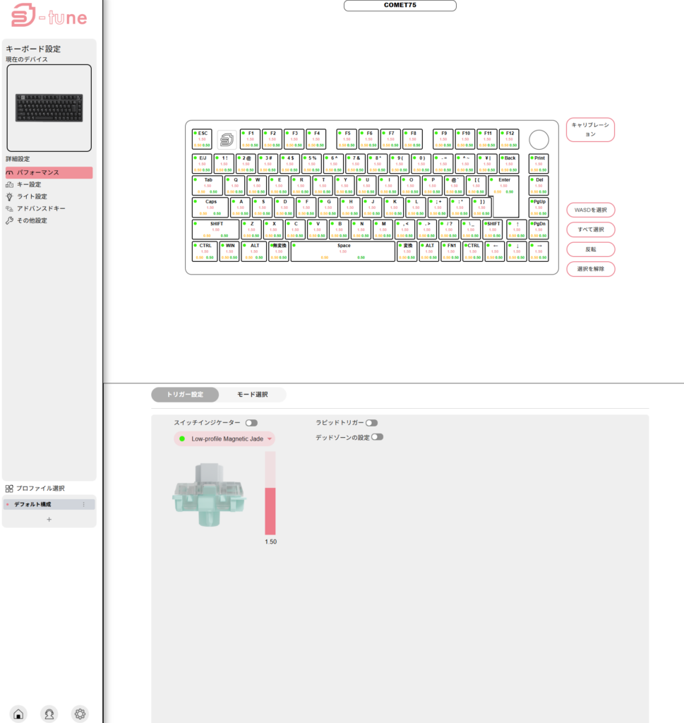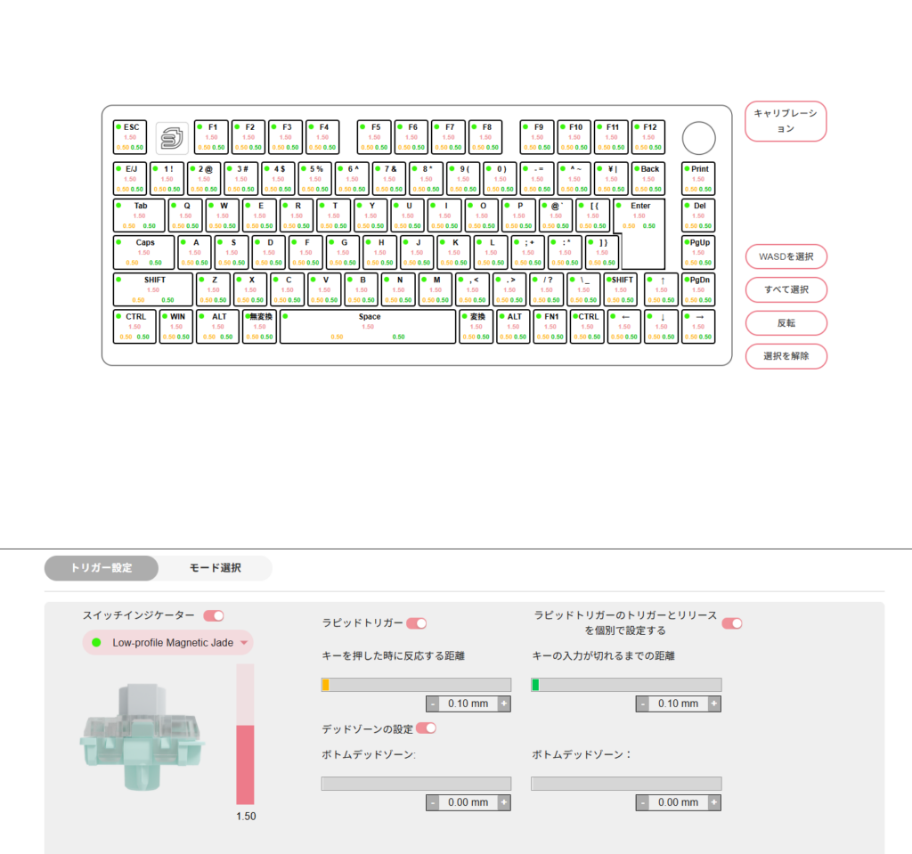 こちらでラピッドトリガーやアクチェーションポイントの設定が可能です。
