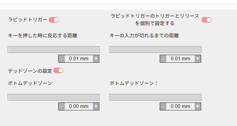 ラピッドトリガーの安定する値にしておくほうが調整がしやすいと考えています。