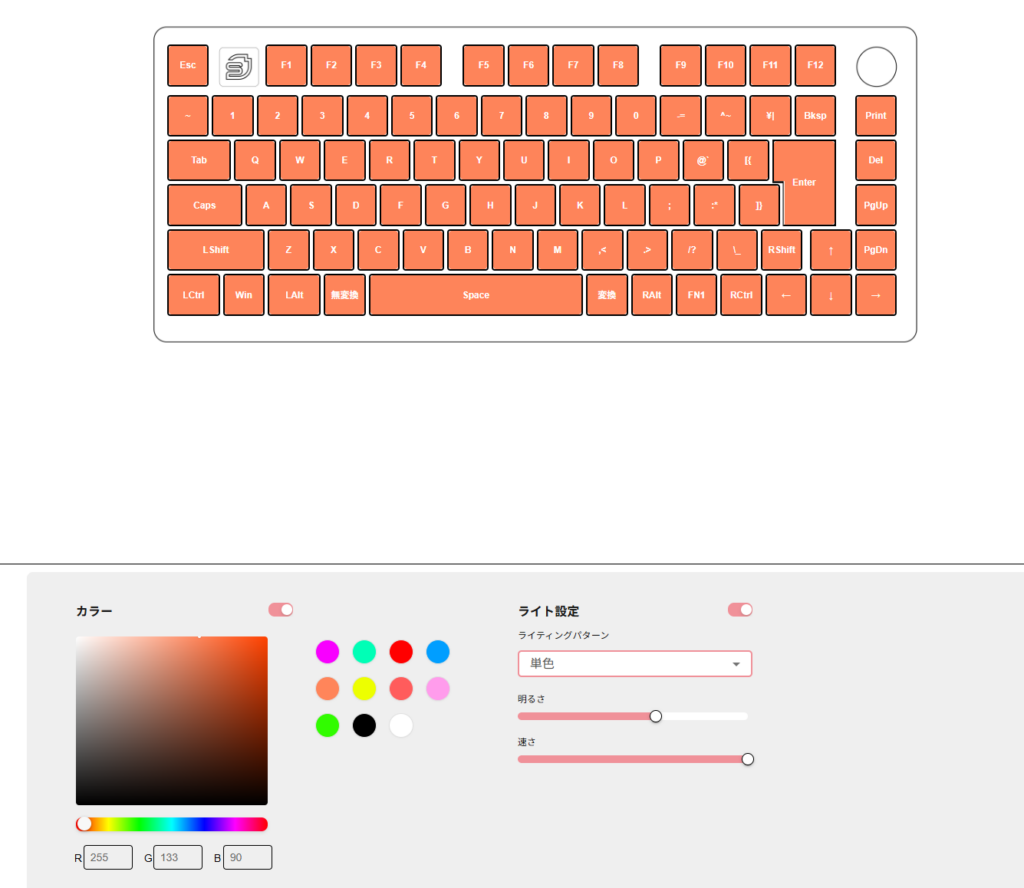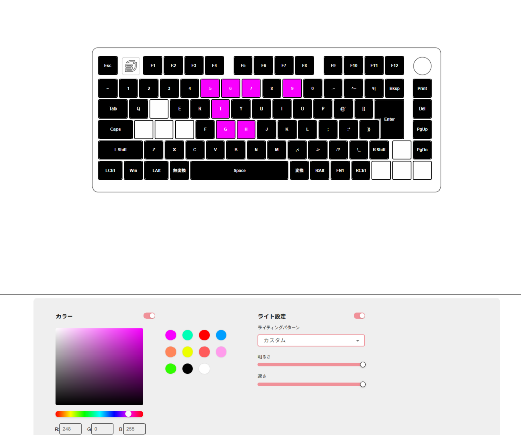 キーごとにはライティングは、ライティングパターンをカスタムにすることで変更可能。