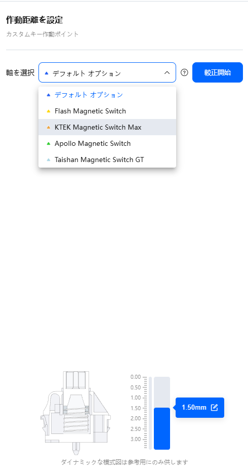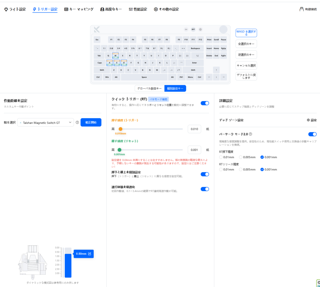 アクチュエーションポイントは「キーが反応するまでの距離=ラピッドトリガーが起動する距離」となります。0.1mm単位で設定でき、最小0.1mmとなります。