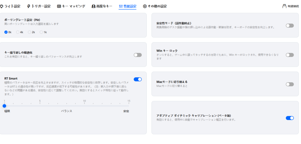 デッドゾーンなし/RT Smart・誤爆防止なしのRT0.005mm-0.01mm程度から実使用でも問題ないレベル感の安定性を感じます。