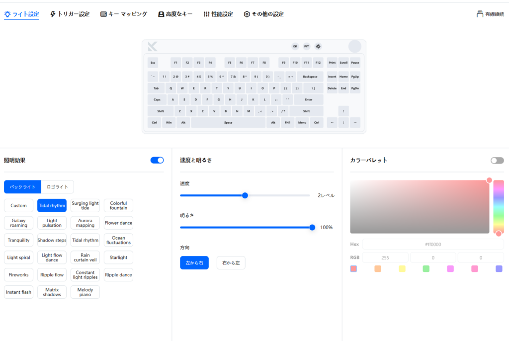 キーのバックライトとロゴのライティング、エフェクトが制御できます。