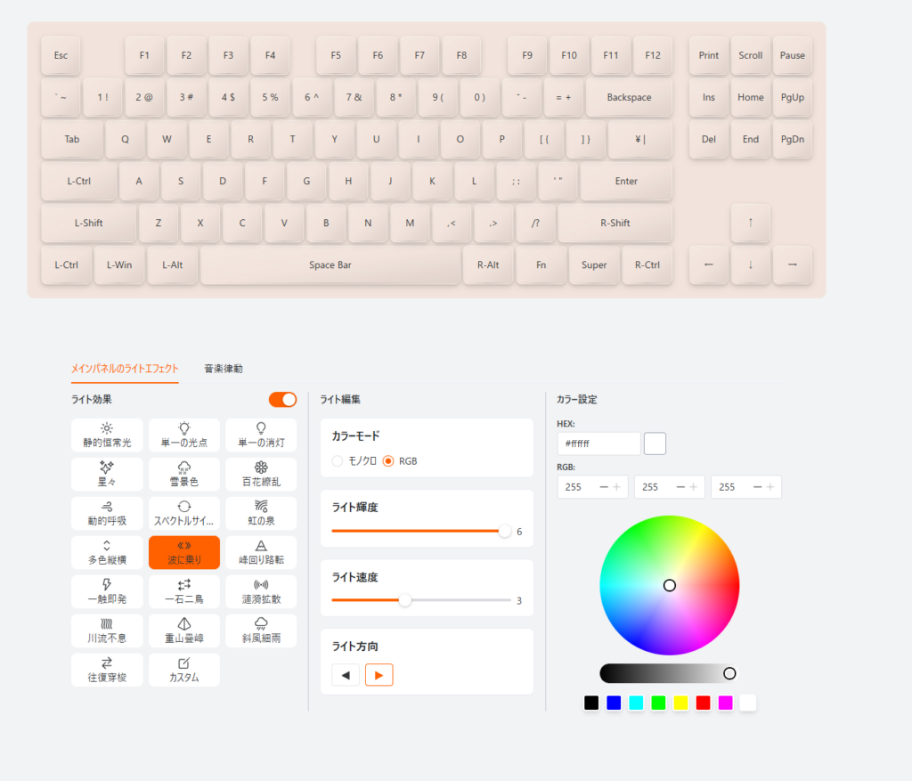 こちらから、ライティングエフェクトや色を変更することが可能です。