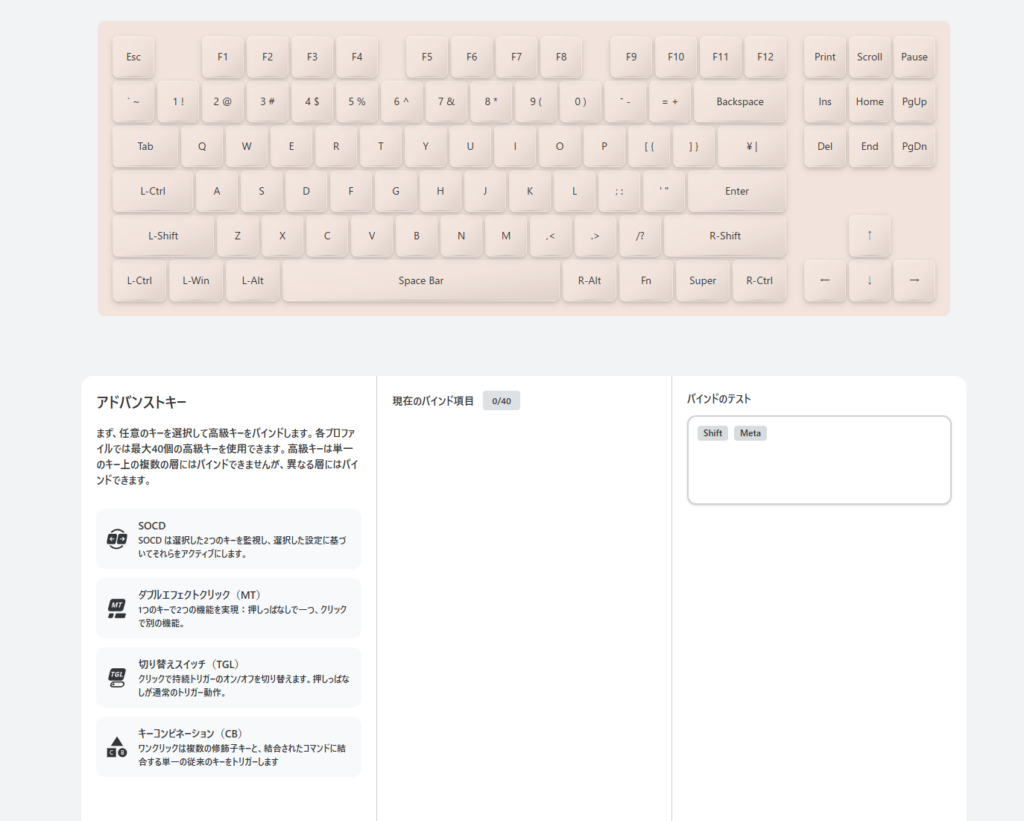 Mod-Tap、SOCD、トグル、キーコンビネーションに対応しています。
