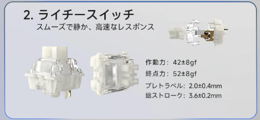 AJAZZのLychee Switchというボックスステムのリニアスイッチが搭載されています。