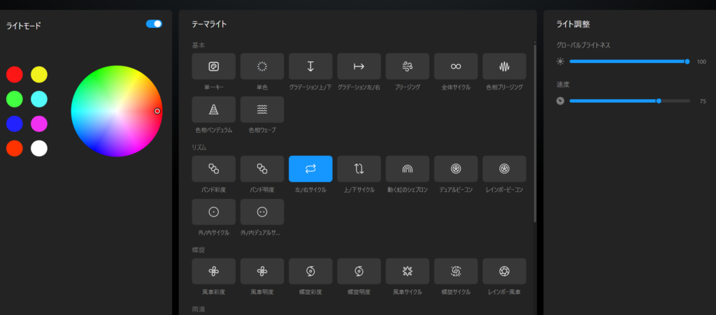 キーごとにライティングの色を選択でき、エフェクトもたくさんありますね。