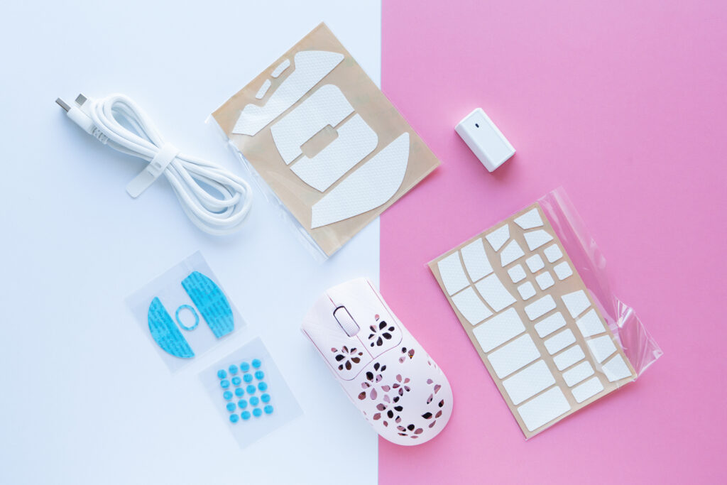 ケーブル、8kドングル、本体、点ソール/面ソール、グリップテープが入っています。