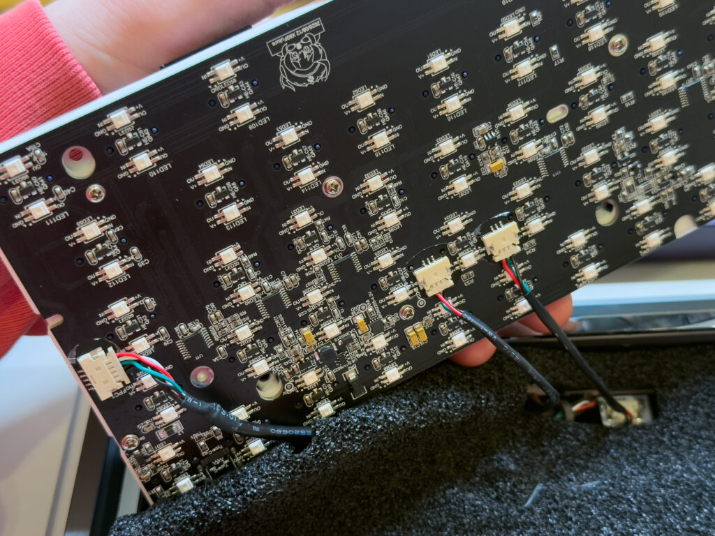PCBを持ち上げると3箇所にケーブルがあります。1本はドーターボード用、2本はLED用です。
