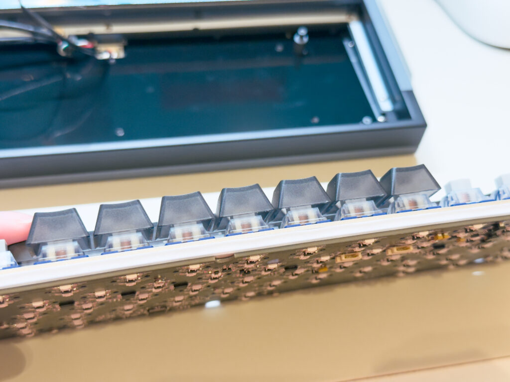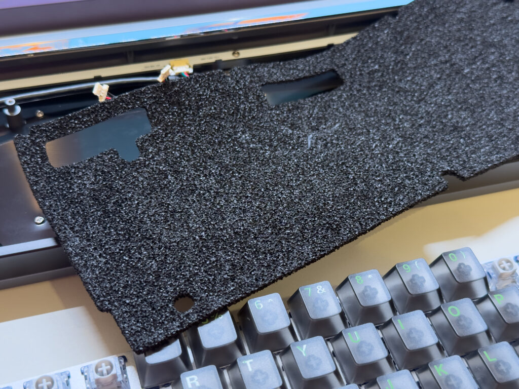 PCBとプレートはネジで止められており、間に挟まるウールで反響や低周波の吸音、打鍵感へのクッション性を確保しと、PETシートで高周波の音を抑えつつクリアな打鍵感を生むよう調整されています。