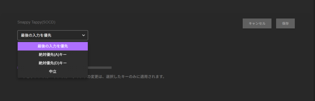 バインドされたキーが同時に押された時、どちらか一方のみを優先して入力を有効にする(最後入力優先 or 絶対優先)か、または両方とも無効にするか(ニュートラル)を設定できます。
