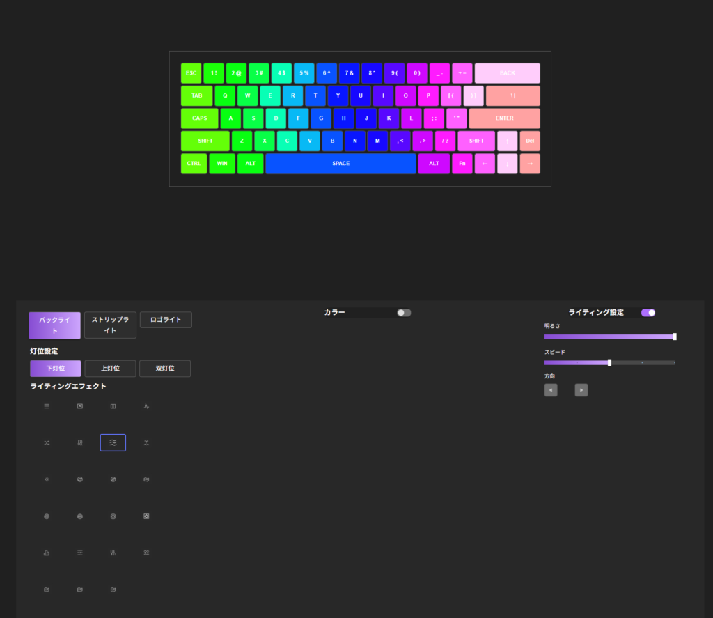こちらからバックライト、ライティングバー、ケース背面のライトを制御することが可能です。